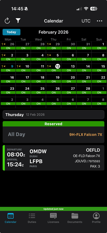 - The bar at the bottom of the Calendar and Duties screen shows the last update time of your data. In online mode, it displays 'Updated just now'. If you go offline and open a flight section within 5 minutes, it will still show 'Updated Just Now'. After 5 minutes, it will show 'Updated 5 minutes ago' and continue to increase until you are back online. Once you are online again, it will show 'Updated Just Now'.