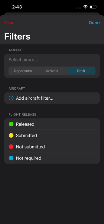 The list is loaded via a “flights and duties for a specific date” request, which takes the most recent filters into account. It adds airport and aircraft from the active filters and then applies the filters to the flights, so the list is filtered by airport, aircraft, and release status.