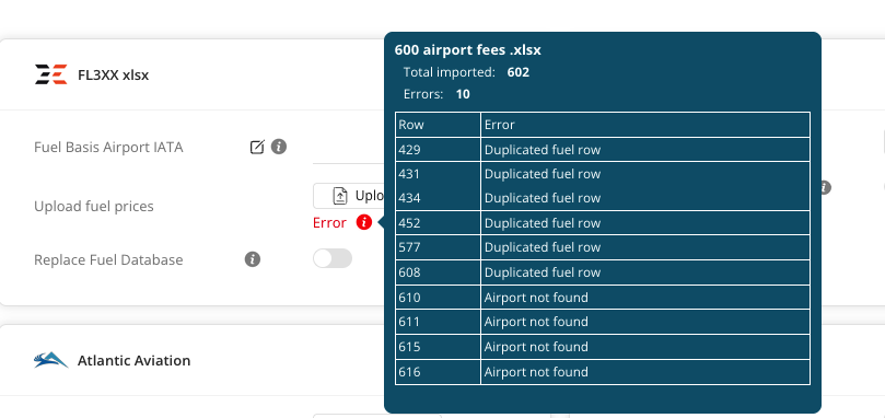 Error Message: An explanation of the failure (e.g., "Duplicated fuel row" or "Airport not found").