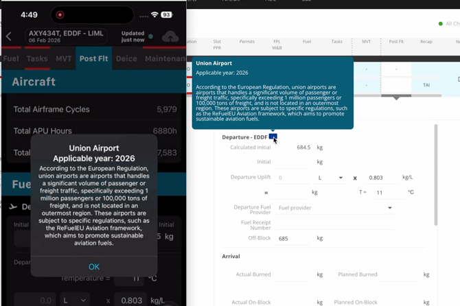 The Mobile Apps mirror the Web App and supports in-flight and post-flight data entry. All ReFuelEU fields are available when the feature toggle is enabled.