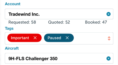 Sales tags help you organize and identify quotes quickly in the FL3XX Sales App. These custom, color-coded labels sync with the web app. Use them to mark quotes like "Empty Leg," "Important," or "Last Minute." You can add multiple tags per quote, but creating or editing tags happens in the web app.