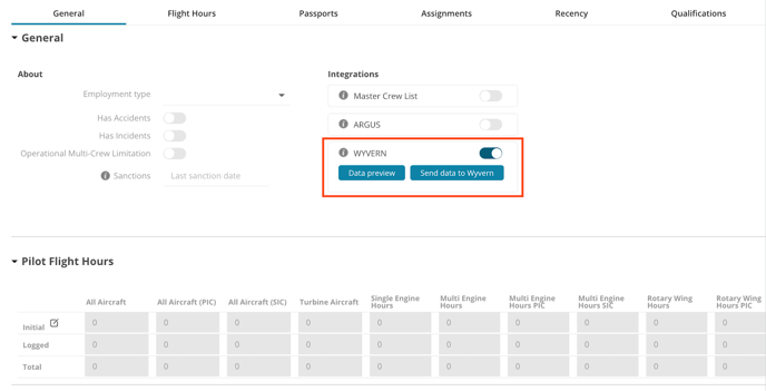 The Wyvern-FL3XX integration automatically syncs pilot flight hours and license-related data, ensuring compliance with Wyvern's standards. It allows operators to easily manage and upload pilot qualifications and flight hours, with options for both manual and automated syncing.